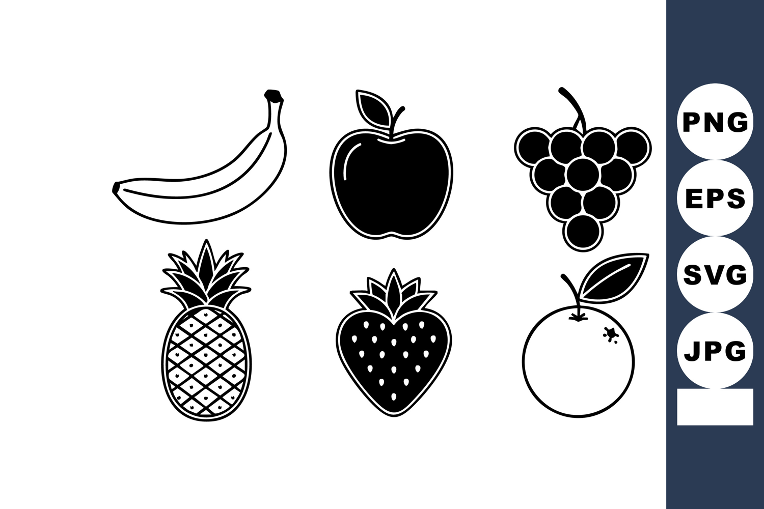 This vector file features black and white fruit icons such as banana, apple, grapes, pineapple, strawberry, and orange in a simple and clean style, perfect for design projects. Calm.