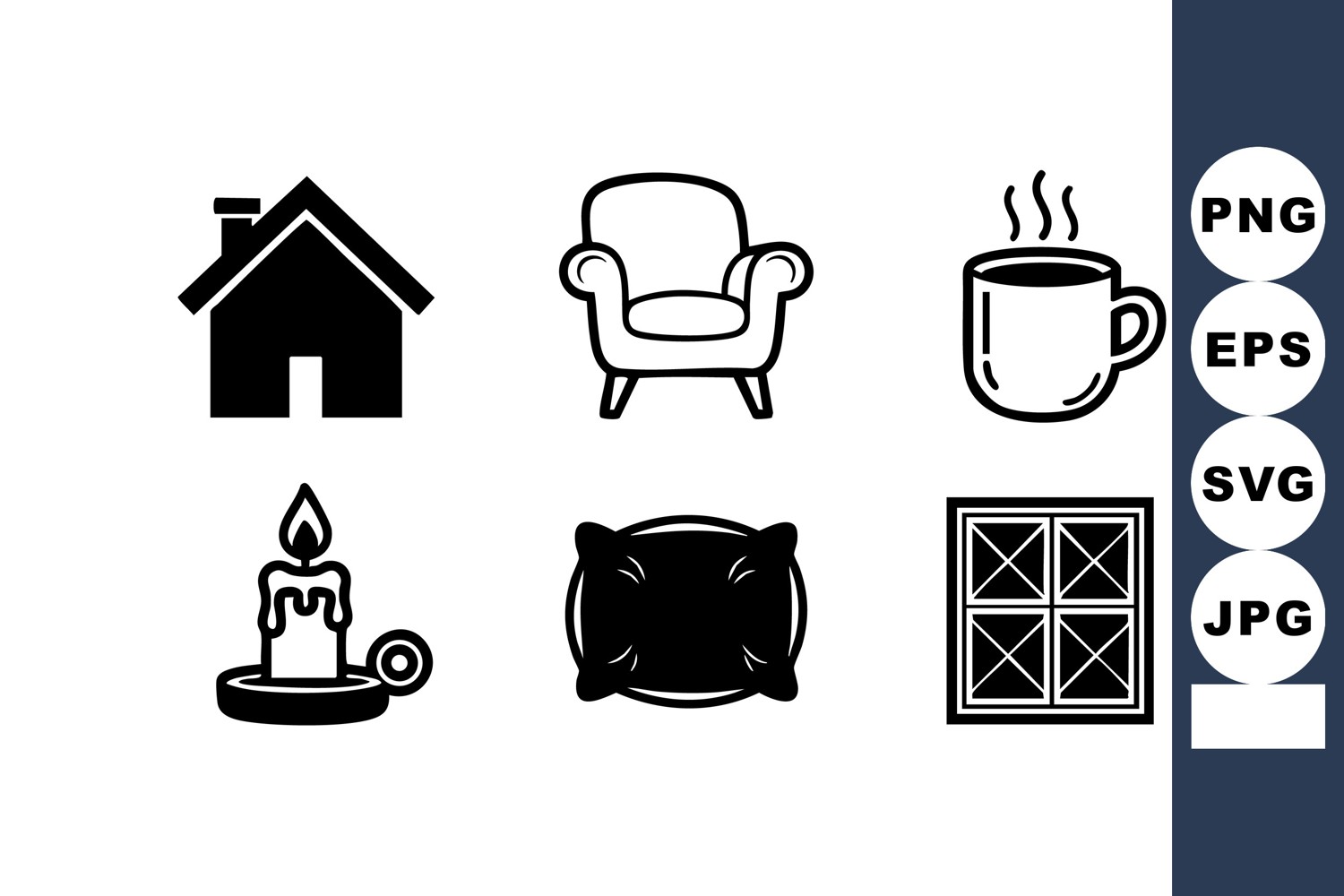 This vector set presents simple black icons representing home comfort elements such as a house, armchair, coffee cup, candle, pillow, and window, evoking warmth and coziness. Calm ambiance.