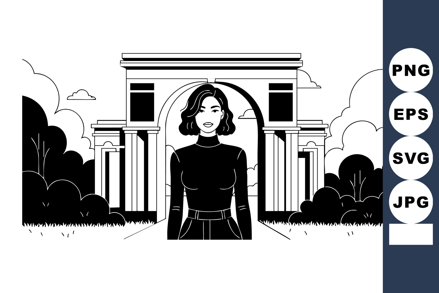 This vector illustration features a confident woman standing before a classical arch structure with trees and clouds in the background, rendered in black and white. The mood is calm and composed.