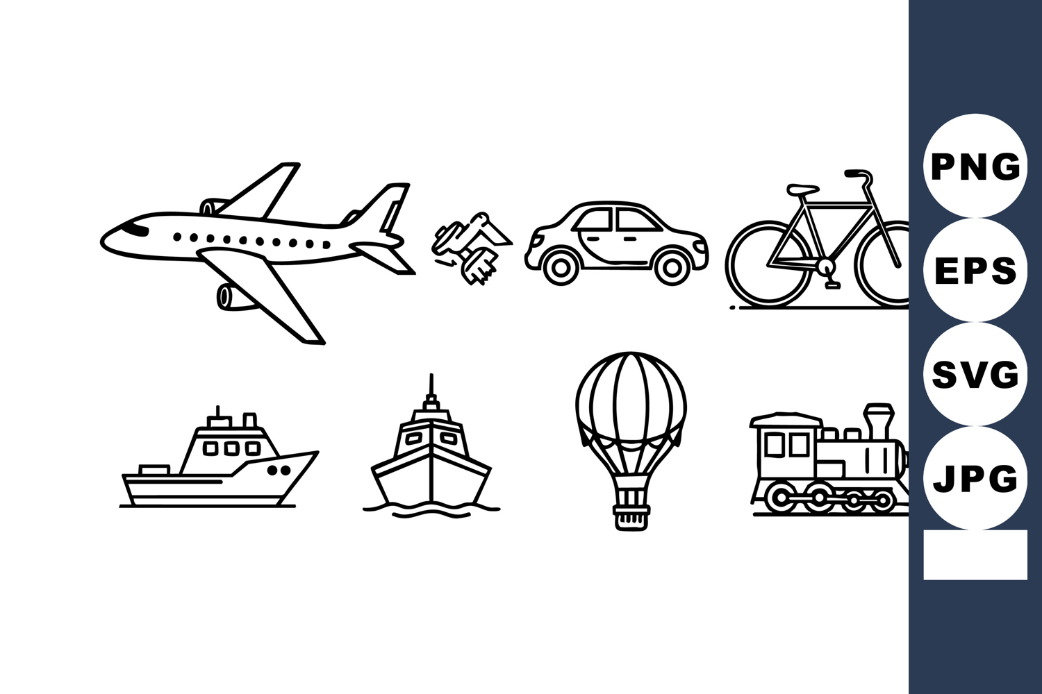 This vector features black line icons of various transportation modes such as airplane, handshake, car, bicycle, ship, boat, hot air balloon, and train in simple style, evoking travel and movement, clean mood.