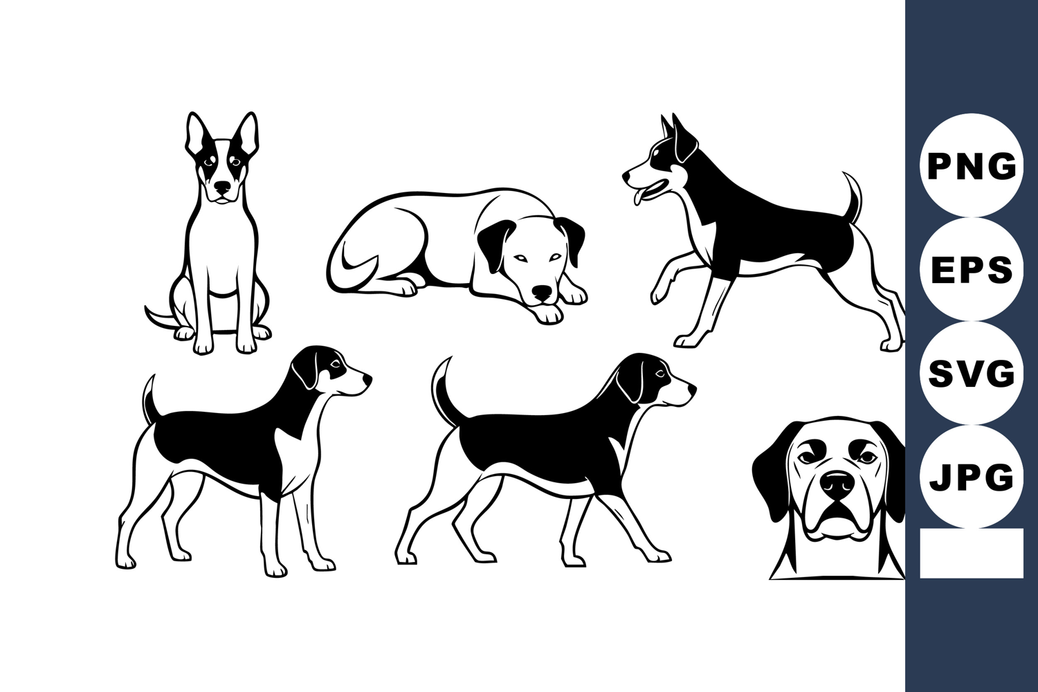 This vector image presents multiple dog breeds in different poses including sitting, walking, and lying down, drawn in clean black and white line art style, simple and clear mood.