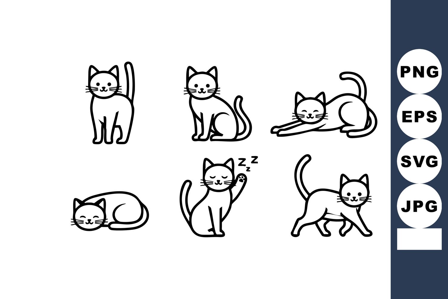 This vector file shows six different black and white cat line art poses including sitting, stretching, sleeping, and walking, perfect for animal and pet art projects with a playful mood.