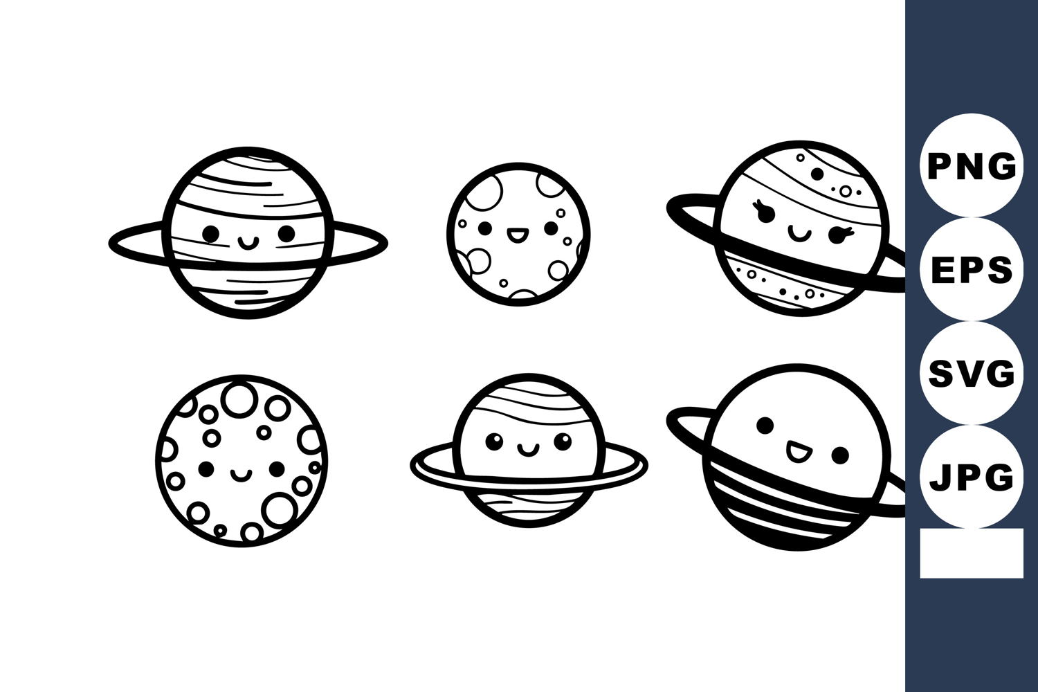 This vector features six cute cartoon planets with rings and smiling faces in black and white. The playful space theme emits a cheerful and friendly mood.