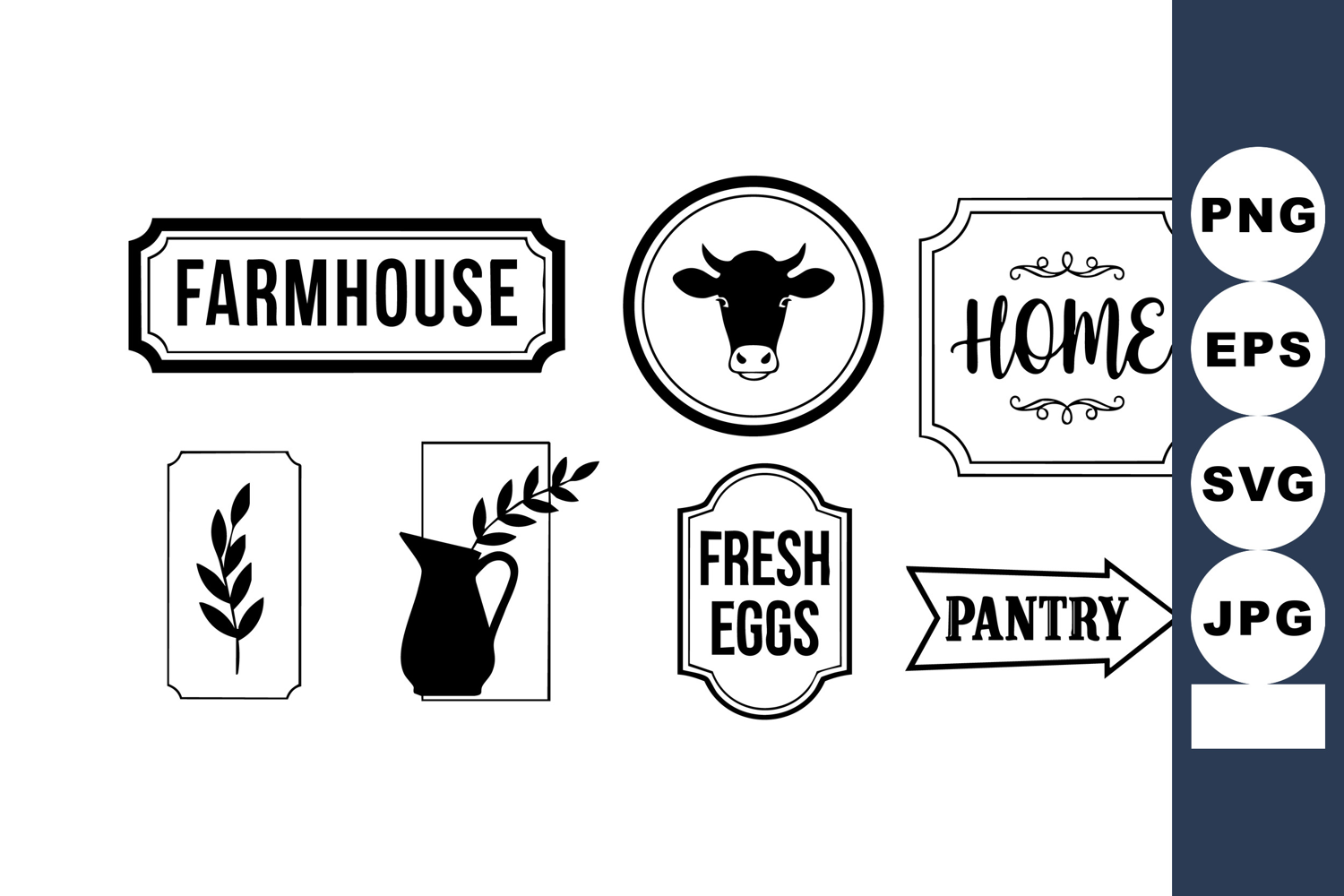 Vector set displays farmhouse-themed kitchen labels with simple black icons and text including fresh eggs, pantry, home, and rustic motifs creating cozy vintage ambiance. Calm.