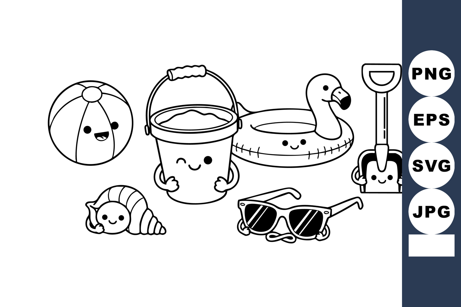 Vector image shows cute beach toys with smiling faces including ball, bucket, sunglasses, float, shovel, and shell in black outline style, cheerful mood.
