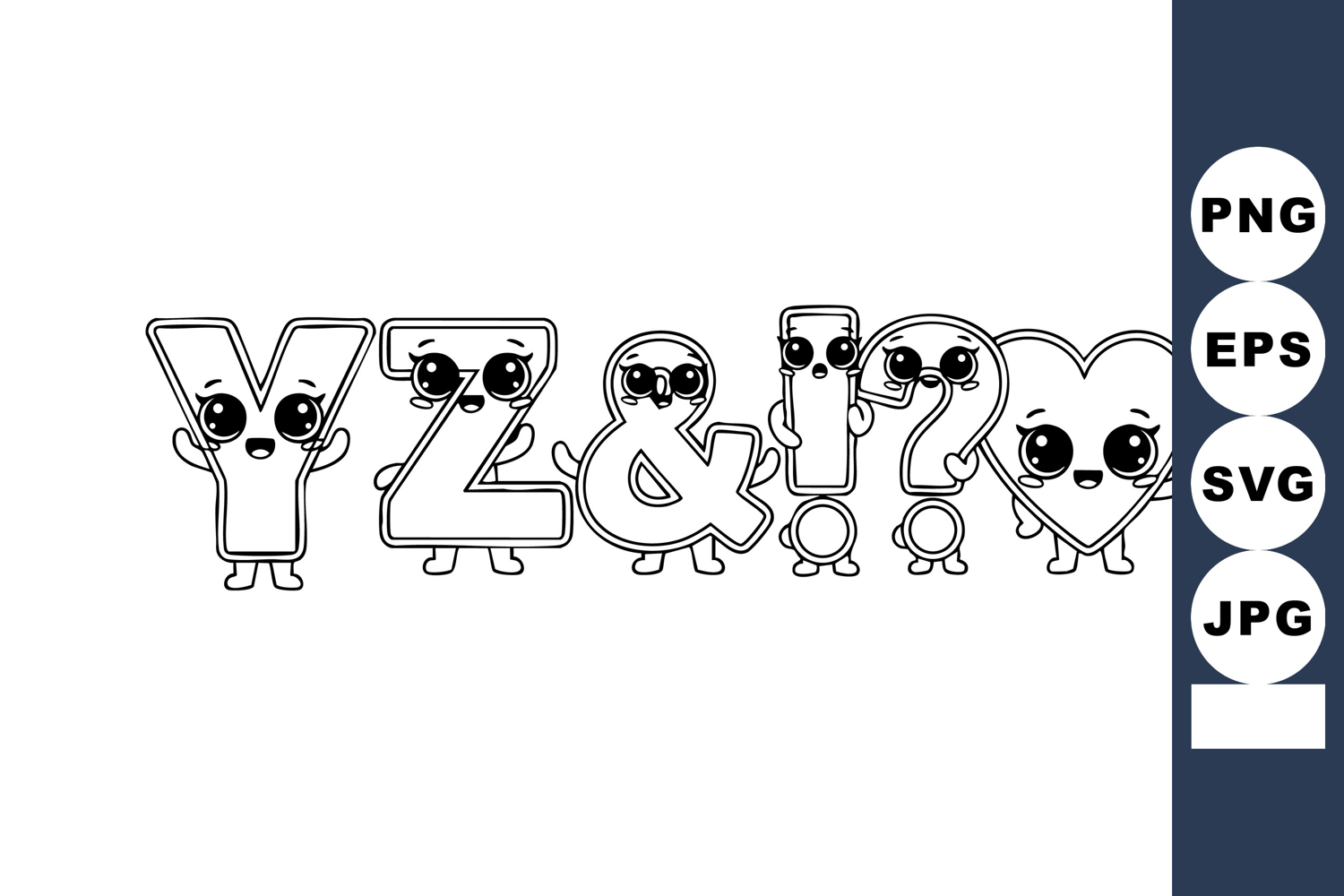 This vector illustration shows adorable cartoon characters shaped as letters Y, Z, &, !, ?, and a heart, all with big eyes and cheerful expressions, creating a playful mood.