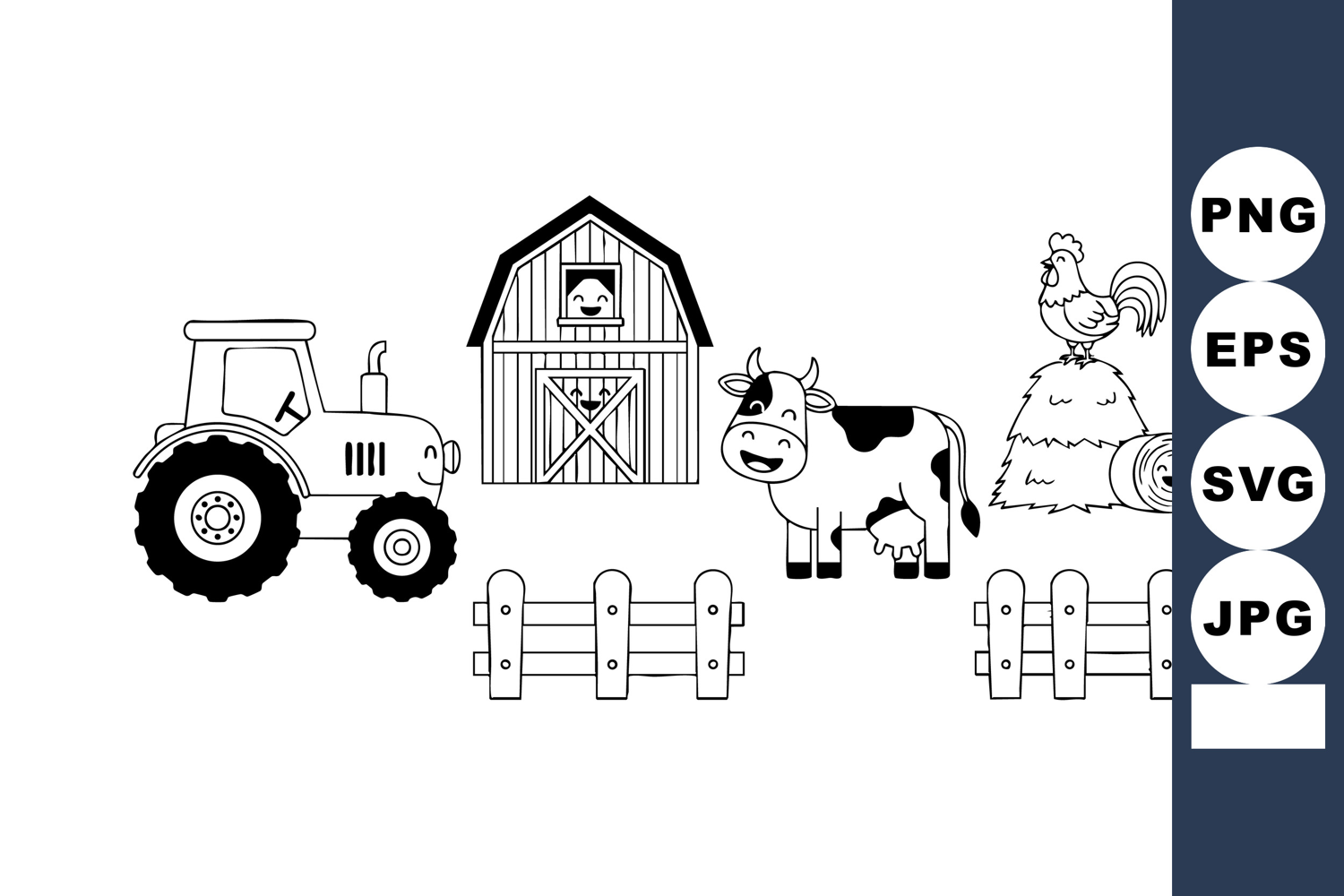This vector features black and white farm animals and equipment including a barn, tractor, cow, rooster, haystack, and fences, illustrating rural agricultural life in a simple style. Cheerful.