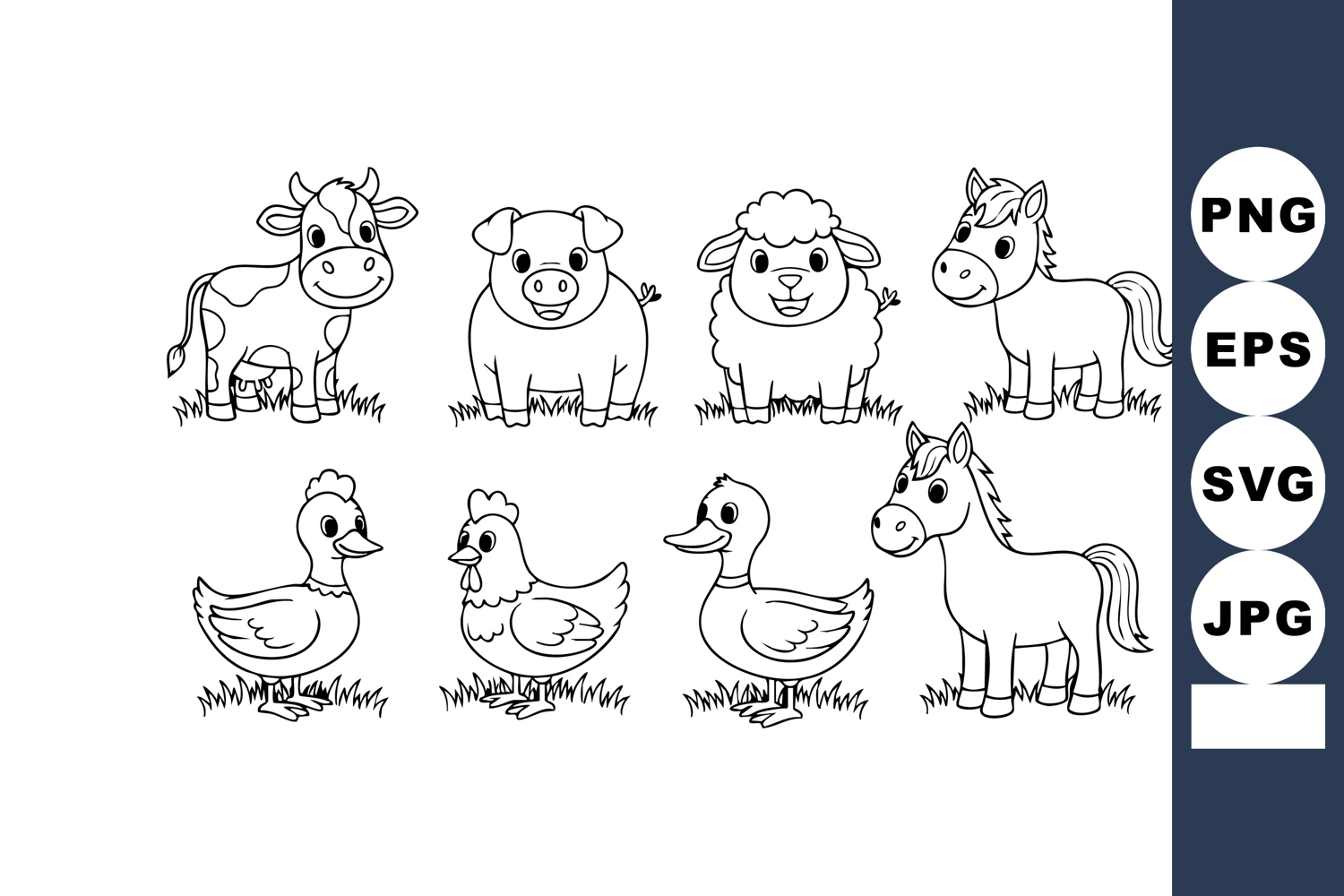Simple black and white line art of common farm animals including cow, pig, sheep, horse, duck, and chicken arranged in two rows, evoking a playful and rustic mood.