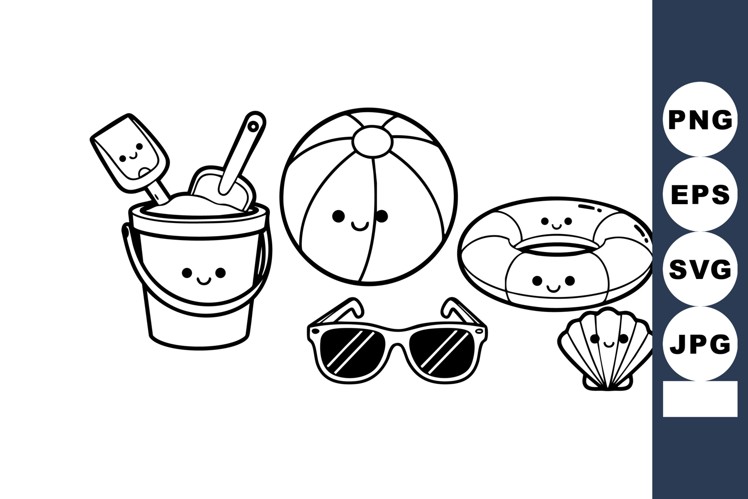 This vector shows cute summer beach toys including bucket, shovel, ball, sunglasses, float, and shell with smiling faces. It evokes playful and cheerful mood.