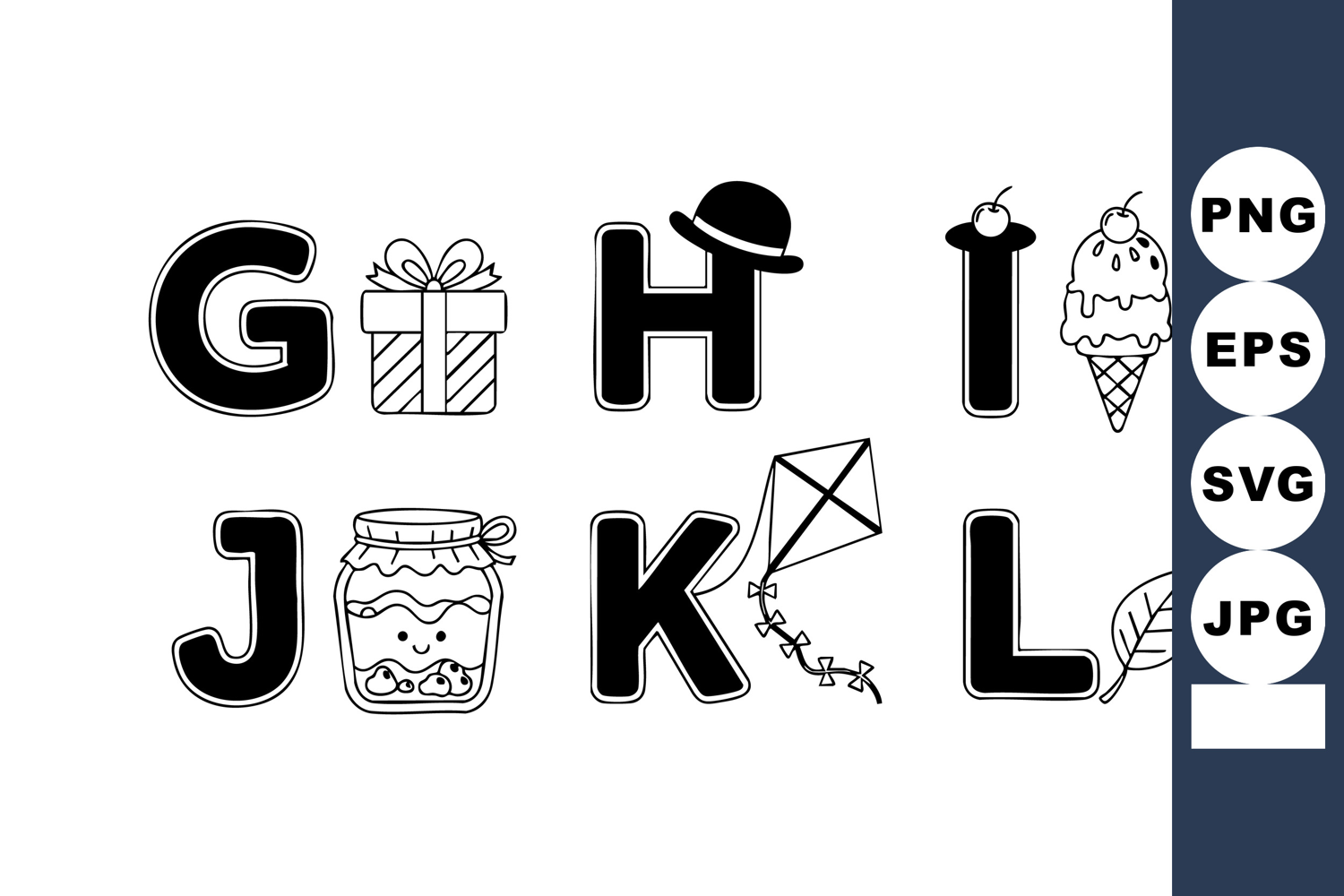 This vector illustration shows black and white alphabet letters with themed icons including a gift box, hat, jar, kite, ice cream, and leaf, creating a playful and creative design. Cheerful mood.