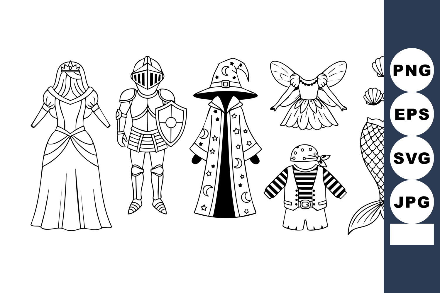 Vector features medieval and fantasy costumes with detailed knight armor, wizard robe, fairy wings, pirate attire, and mermaid tail in black and white line art style, creative and playful.