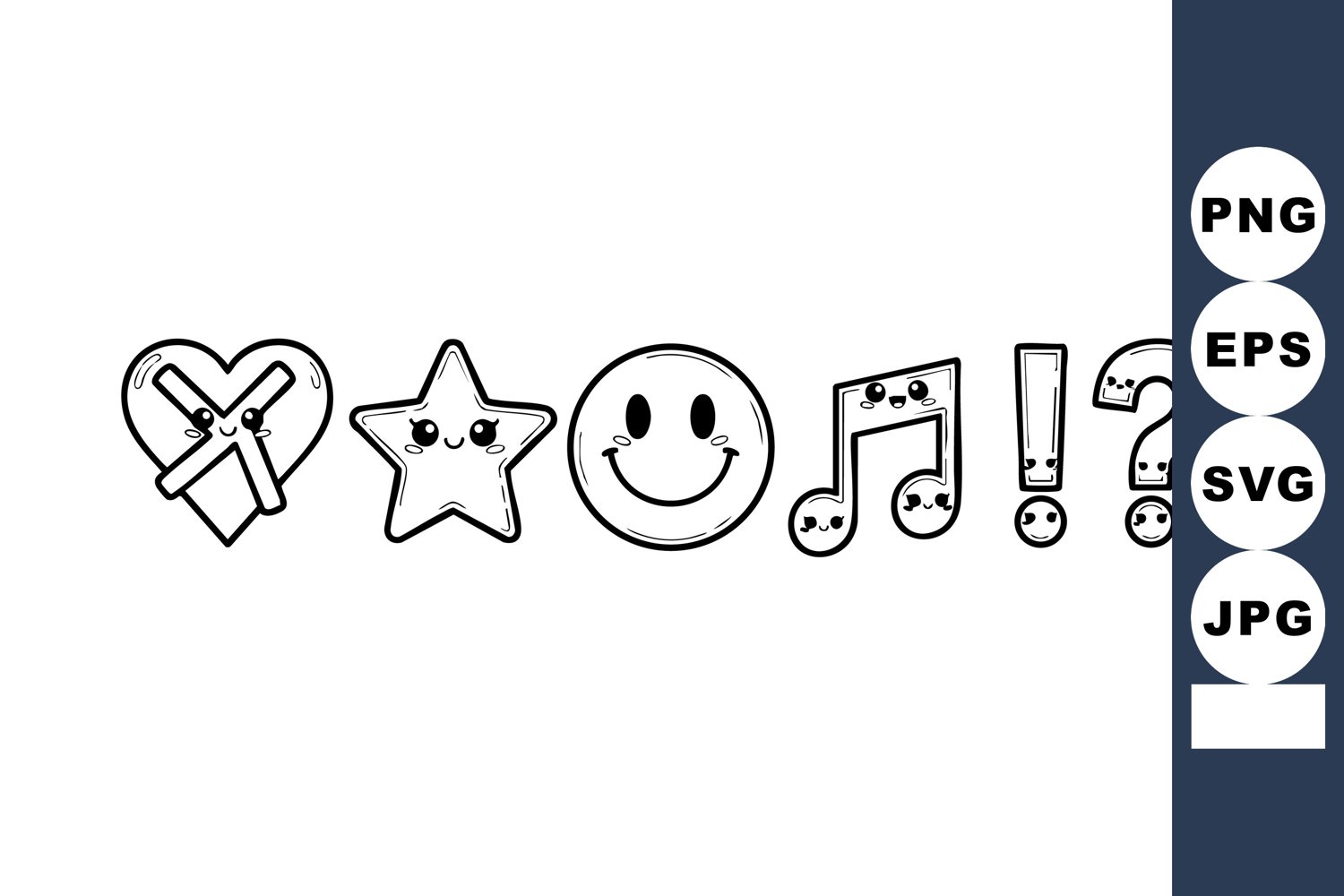 This vector features a charming set of kawaii emoticons in black and white style, including heart ribbon, star, smiley face, musical note, exclamation, and question marks, creating a playful mood.