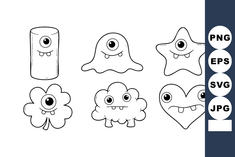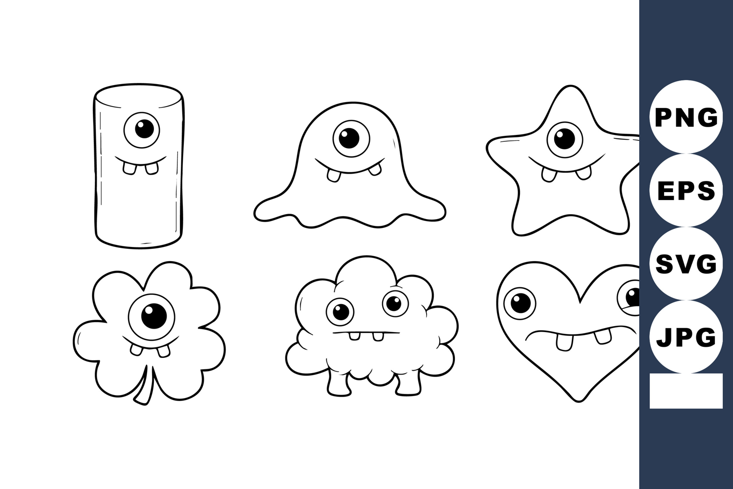 Illustration shows six unique cute monster characters with different shapes and facial features in a simple black and white line art style. Playful and charming mood.