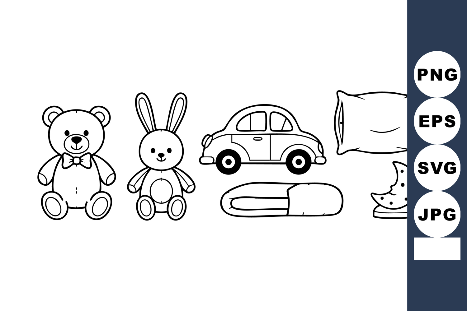 This vector line art features childrens toys and objects such as a teddy bear, rabbit, car, pillow, capsule, and crescent moon, presented in simple black outlines, playful and clean.