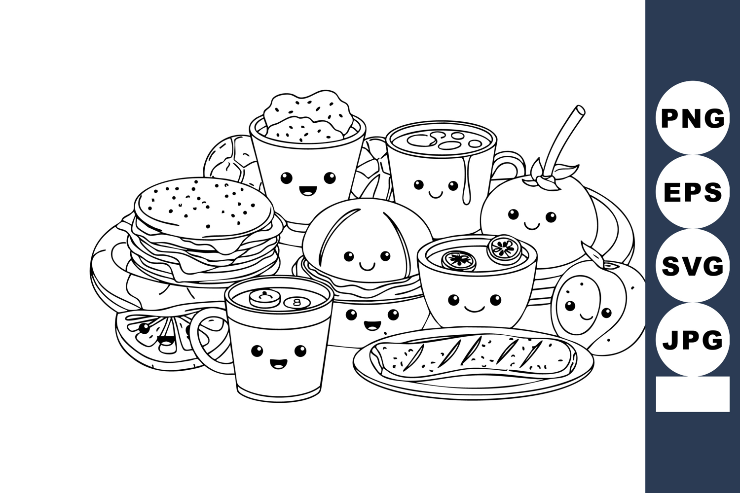 This vector illustration features cheerful breakfast foods like pancakes, coffee, juice, toast, and eggs with smiling faces, creating a playful and friendly atmosphere. Bright and fun mood.
