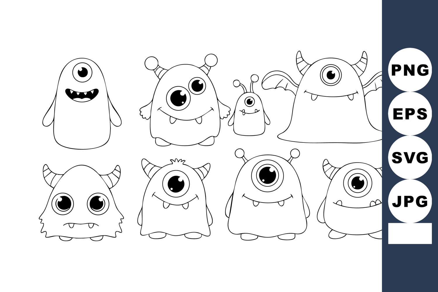 Collection of cute funny cartoon alien monsters with big eyes and horns in black and white line art style. Playful and imaginative mood.
