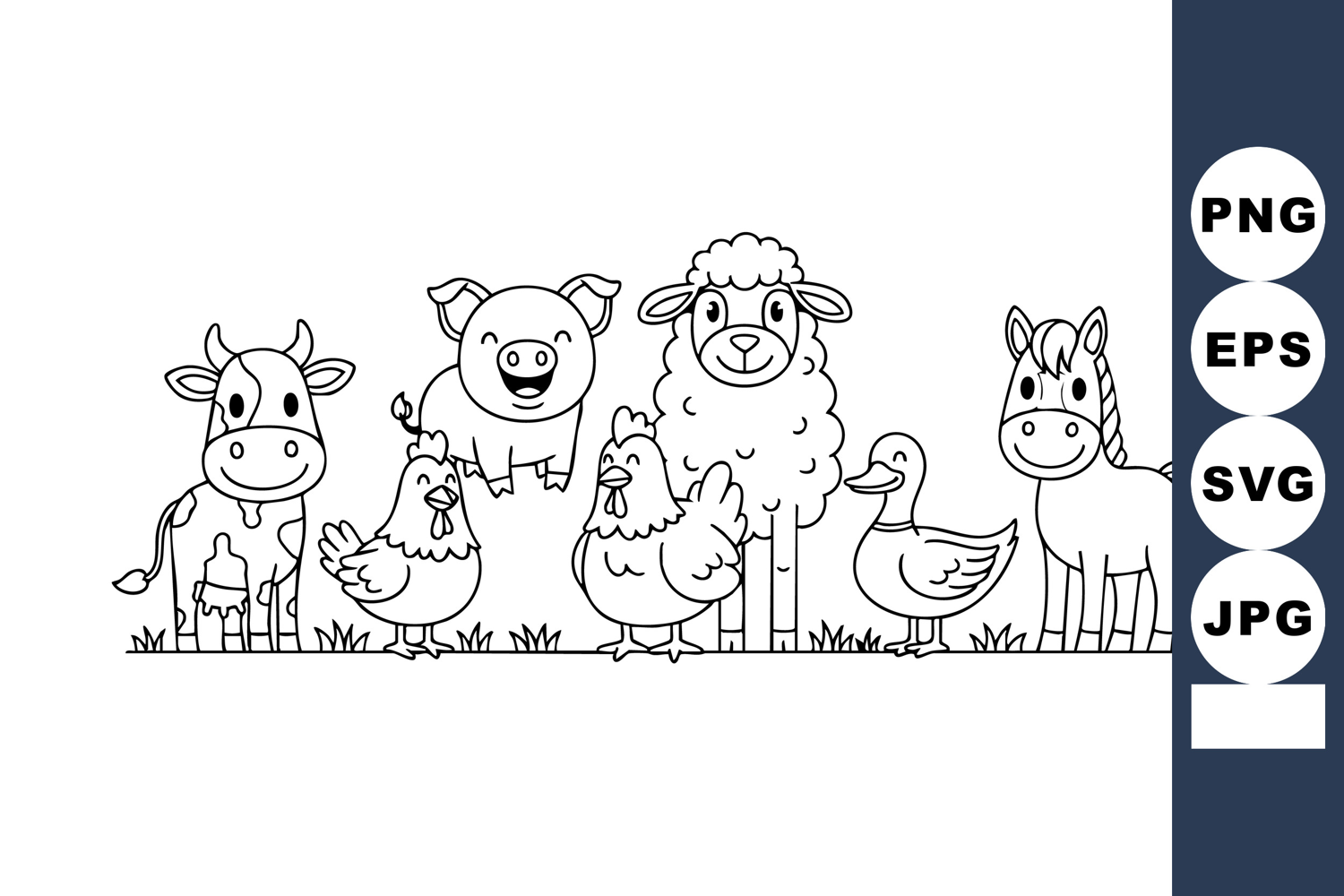This vector shows a group of farm animals including a cow, pig, sheep, two chickens, a duck, and a horse all drawn in simple black line art style on white background, charmingly minimalistic and playful.
