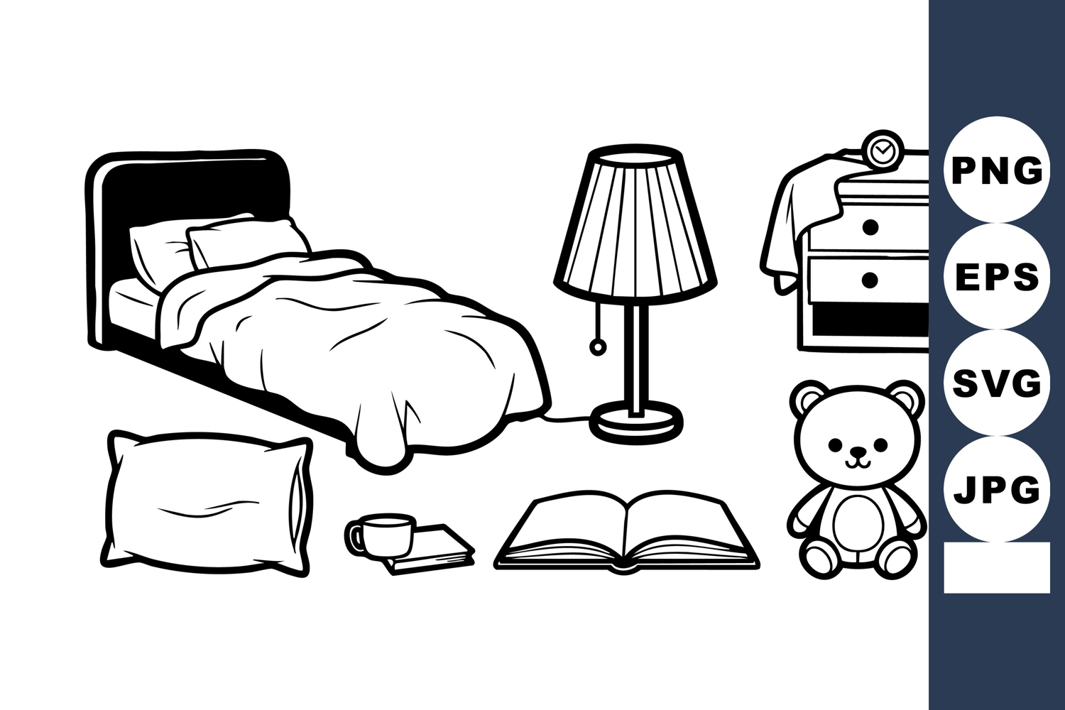 Vector image showing child bedroom essentials including bed, lamp, bedside table, pillow, book, and teddy bear in simple black and white style, calm and cozy mood.