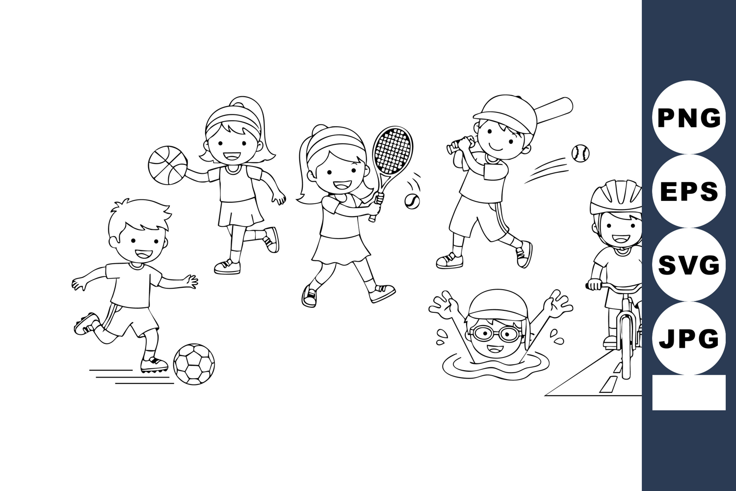 Vector line art shows children engaging in various sports such as soccer, basketball, baseball, swimming, and cycling in a lively and energetic scene. Playful and dynamic mood.