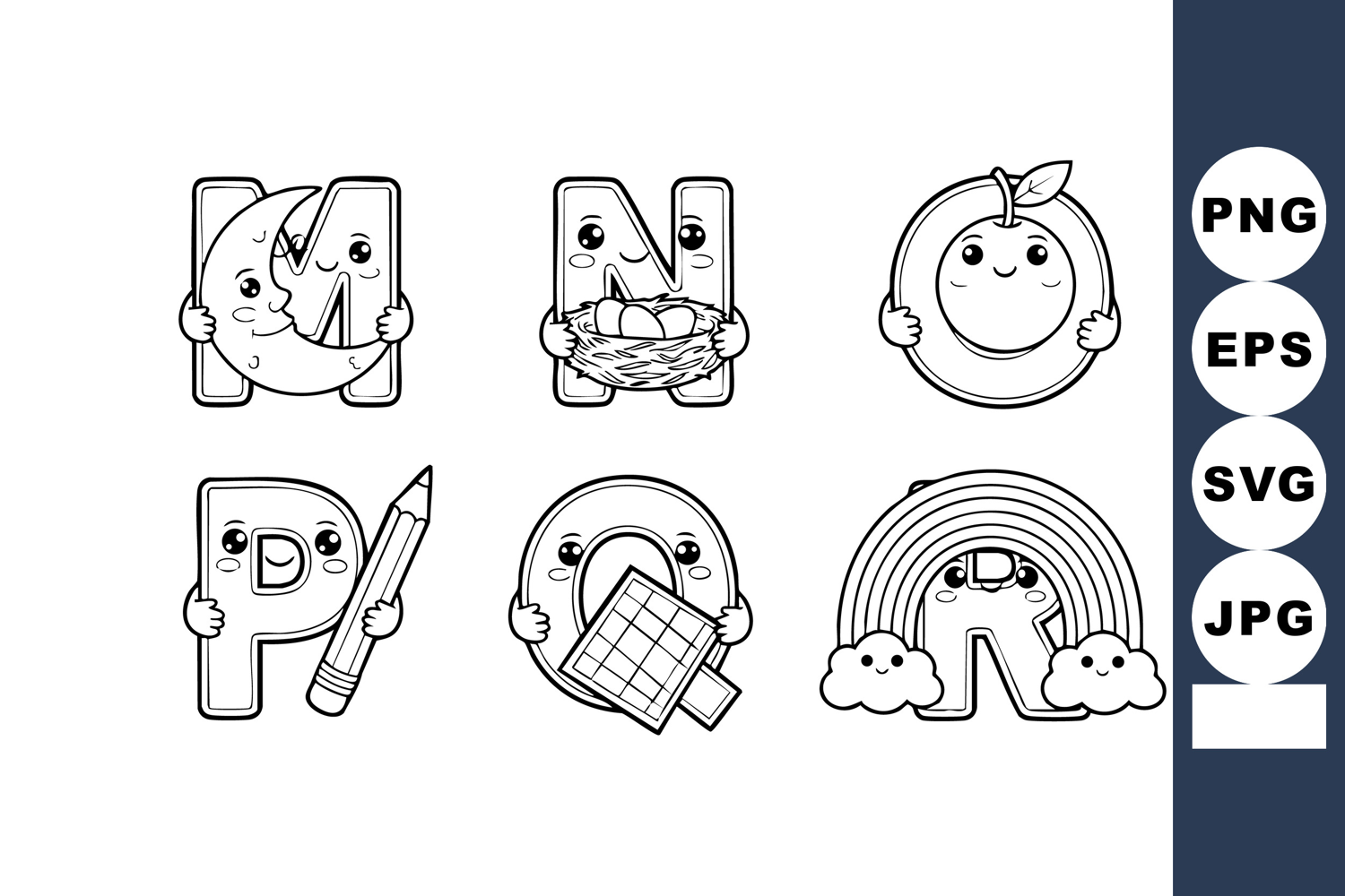 This vector image features alphabet letters a, n, o, p, q, and r with charming faces and objects in black and white style, creating a playful and friendly mood.