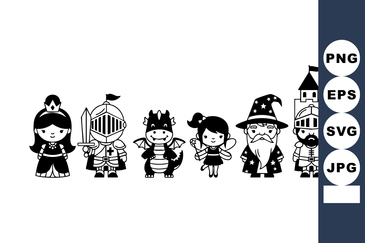 Black and white vector illustration of medieval fantasy characters such as princess, knight, dragon, fairy, wizard, and castle guard, presented in a charming simple style, playful mood.