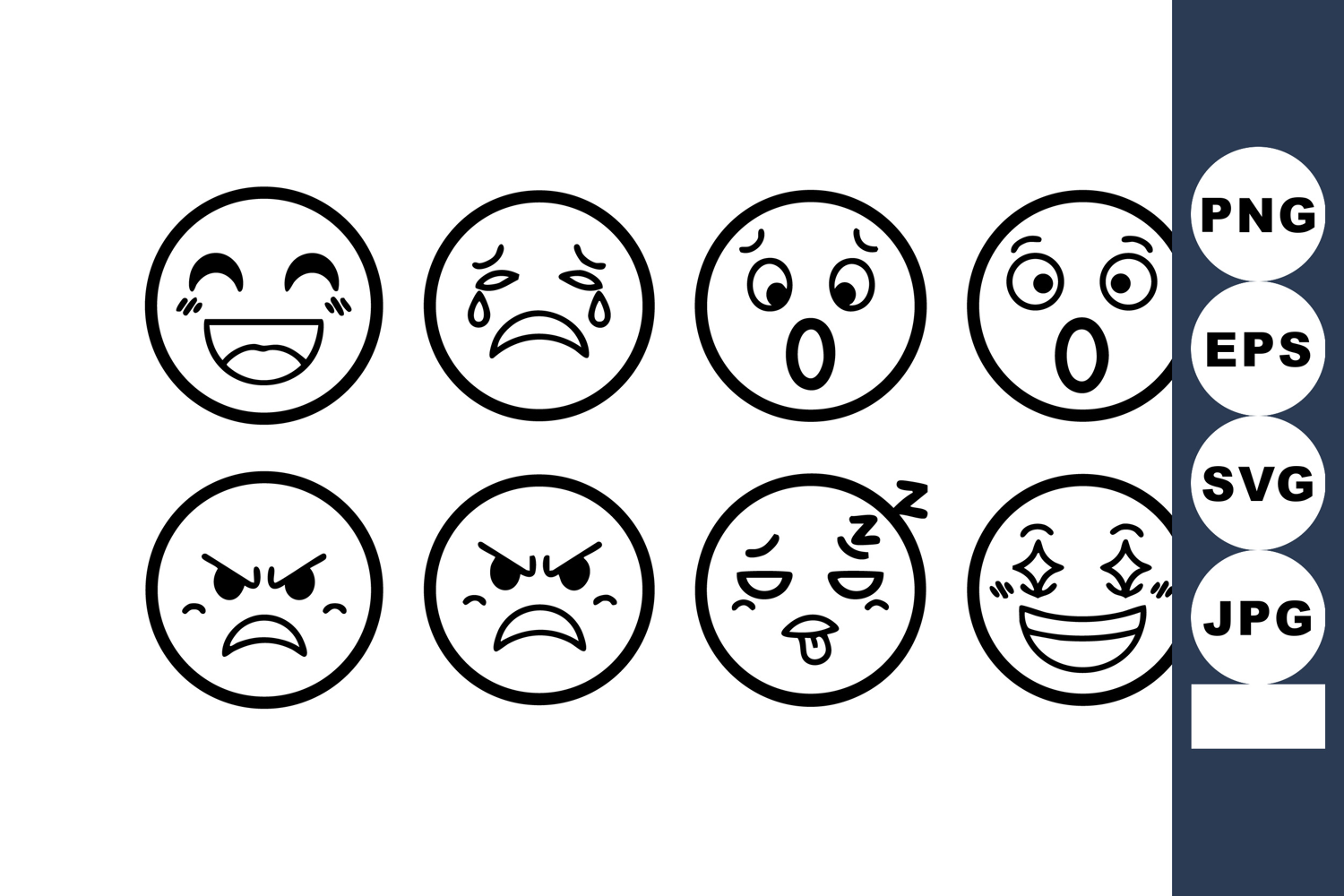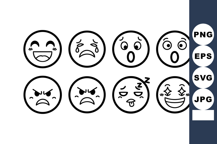 This vector set features eight circular emoji faces expressing happiness, sadness, surprise, anger, sleepiness, and joy in a simple black outline style, conveying diverse emotions clearly and playfully.