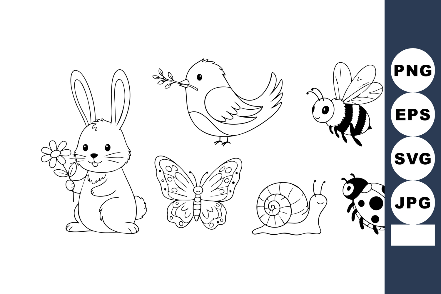 This vector line art features a cute Easter bunny holding flowers surrounded by a flying bird, a bee, a butterfly, a snail, and a ladybug in cheerful style. Playful and charming.