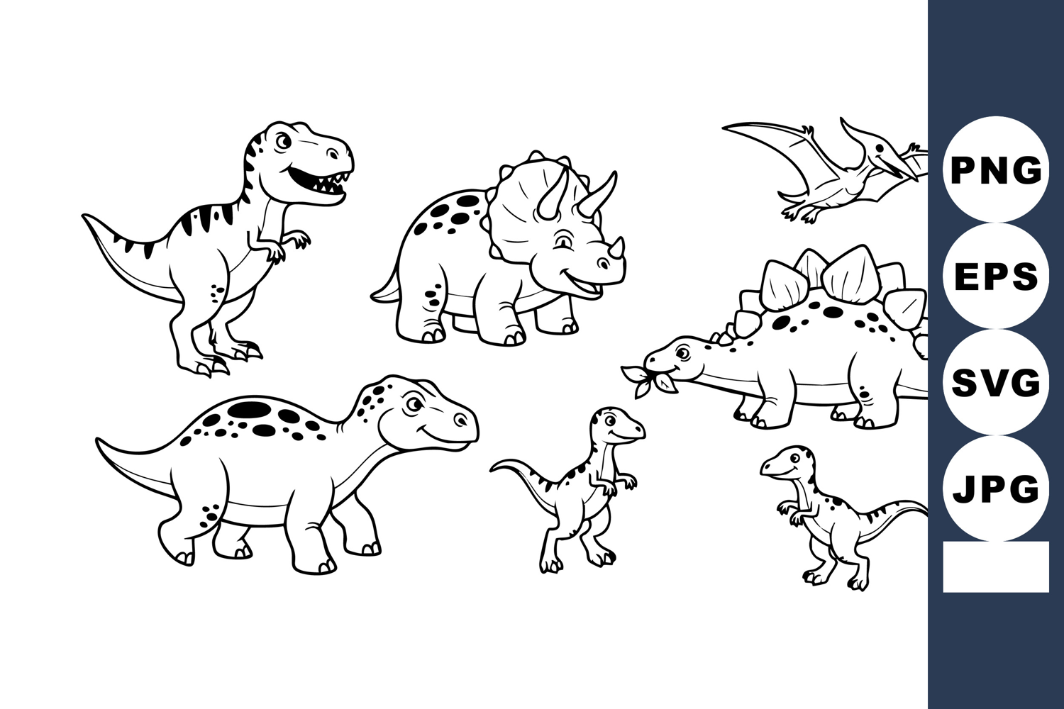 This vector set features cartoon style dinosaurs including tyrannosaurus, triceratops, stegosaurus, and pterodactyl in simple black and white line art, perfect for children’s creative projects and playful mood.