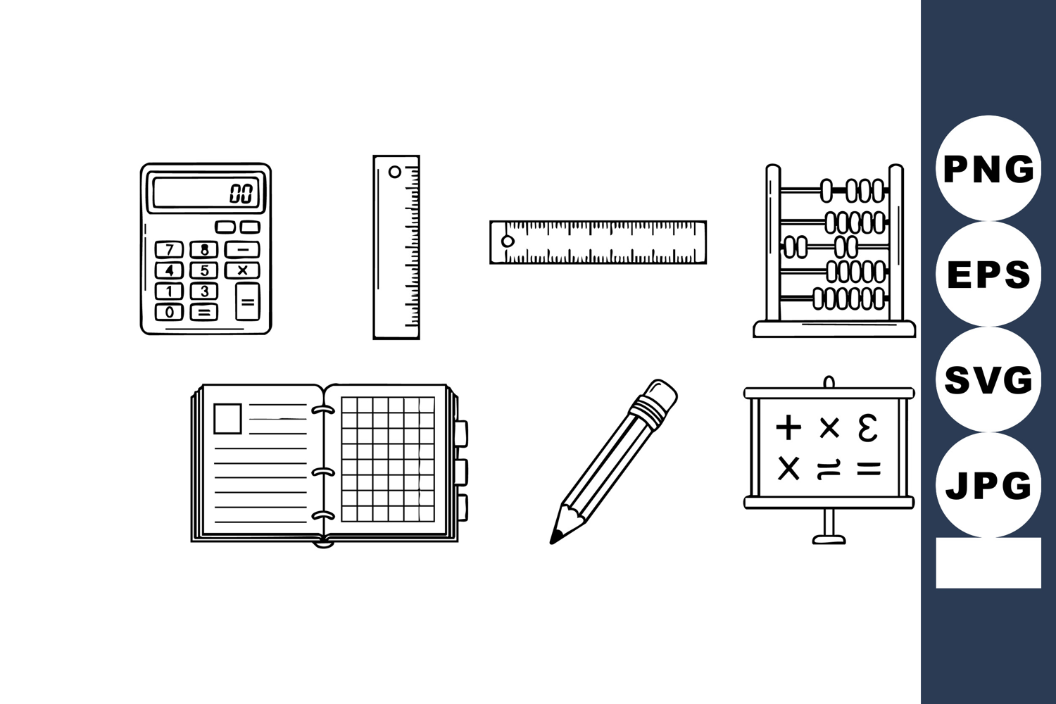 This vector set features essential mathematics tools including a calculator, ruler, abacus, pencil, notebook, and blackboard with math symbols. Ideal for education and teaching purposes. Informative mood.