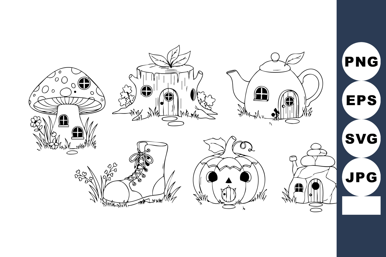 This vector image shows six black and white cute Halloween-themed houses shaped like a mushroom, pumpkin, teapot, and other whimsical objects. The spooky yet charming design creates an eerie mood.