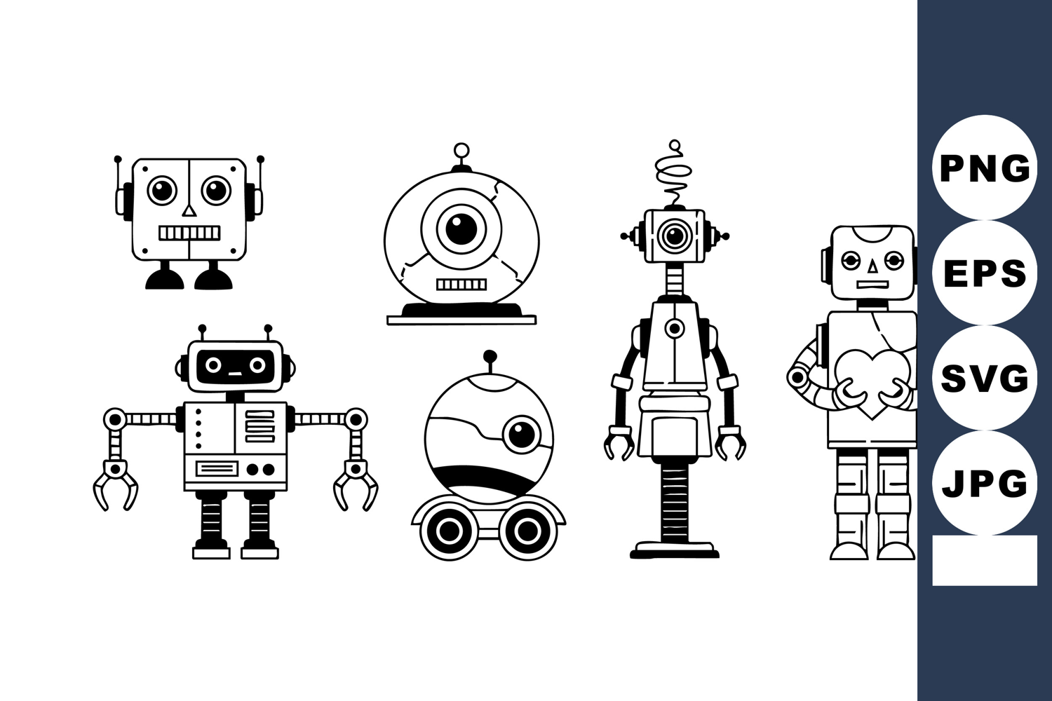 The image shows six different robot designs in black and white, featuring vintage and futuristic styles with distinct shapes and facial expressions, presented in a clean vector format. Playful mood.