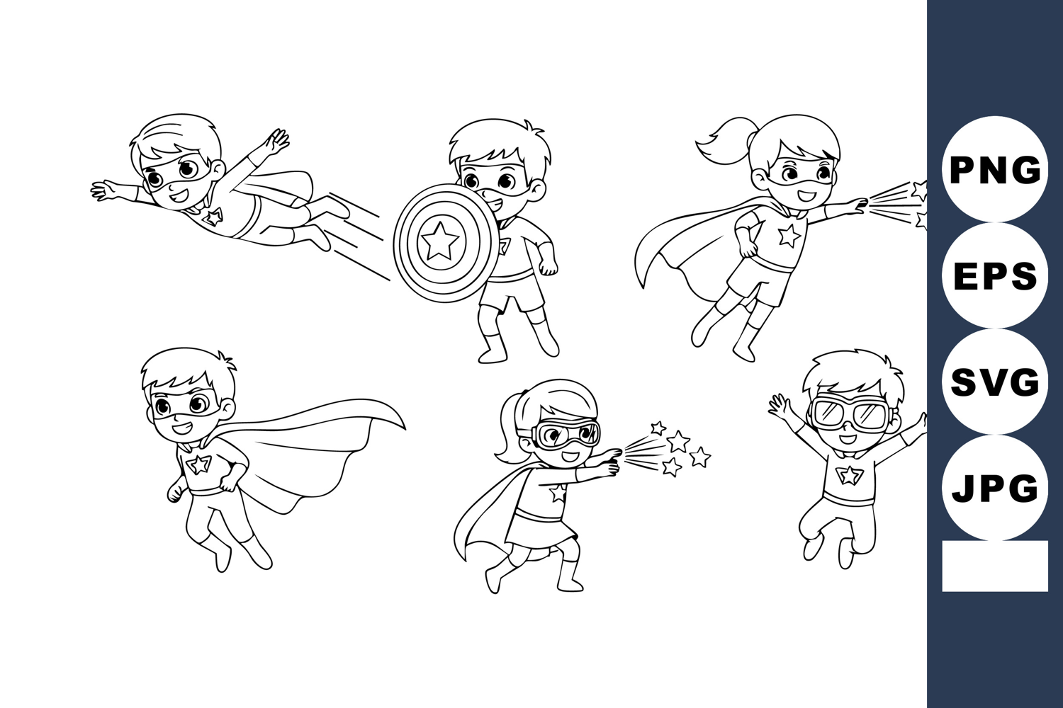 This vector image shows six superhero children in different action poses, including flying, fighting, and celebrating, all depicted in a simple black and white cartoon style. Energetic and playful mood.