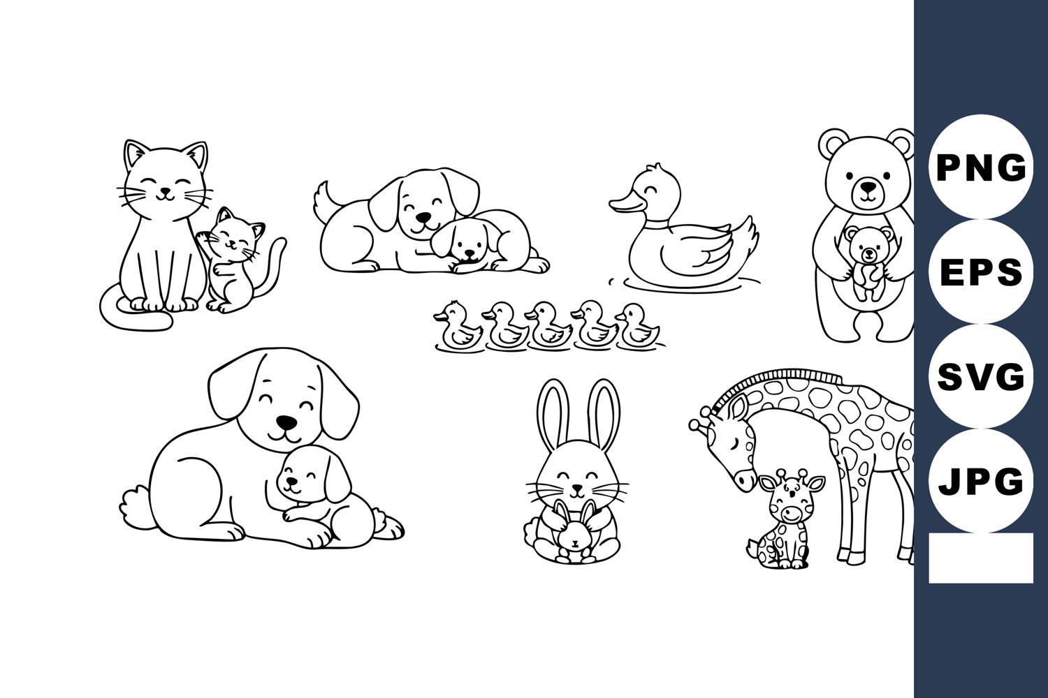 This vector shows various playful pets and wild animals including puppies, kittens, ducklings, bunnies, and giraffes in simple line art style, evoking friendly and charming mood.