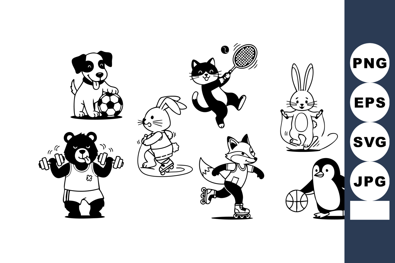 This vector illustration shows seven cartoon animals engaging in various sports such as soccer, tennis, basketball, and skating, all depicted in lively and playful action. Energetic and fun.