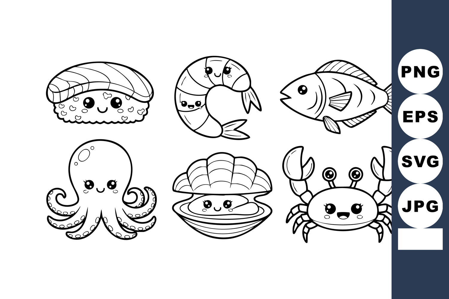 This vector collection features adorable seafood characters including sushi, shrimp, fish, octopus, clam, and crab all with kawaii faces, presented in a simple black line style, cheerful mood.