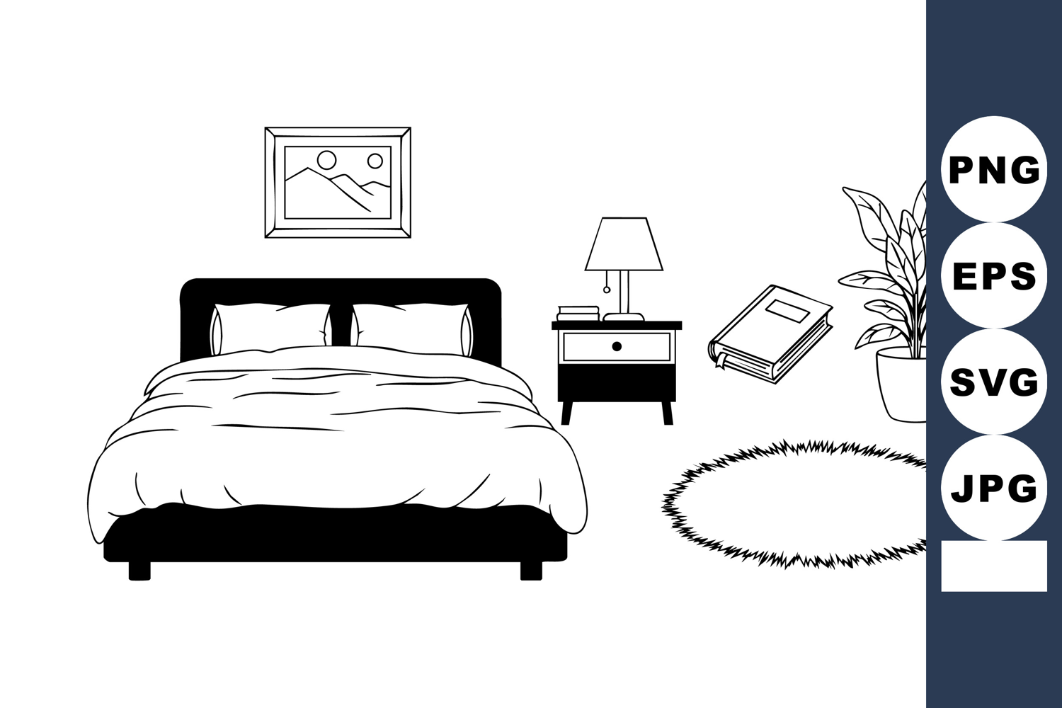 This vector line art shows a bedroom interior with a bed, nightstand, lamp, potted plant, book, and round carpet, presenting a minimal and cozy atmosphere. Calm and simple.