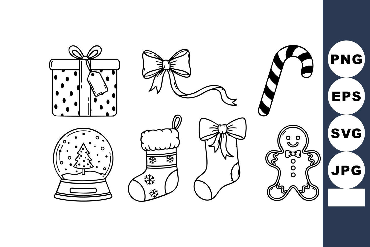 This vector collection shows black and white Christmas icons including a gift box, candy cane, stockings, bows, snow globe, and gingerbread man, creating a festive and cheerful mood.