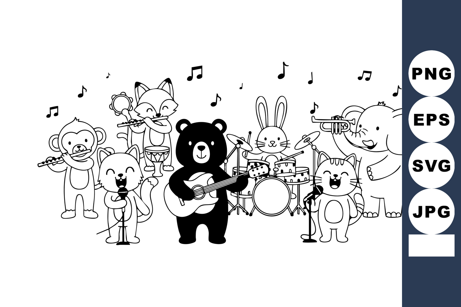 This vector illustration shows a cute animal band with a bear playing guitar, elephant on trumpet, and other animals performing music with notes floating around, lively and fun.