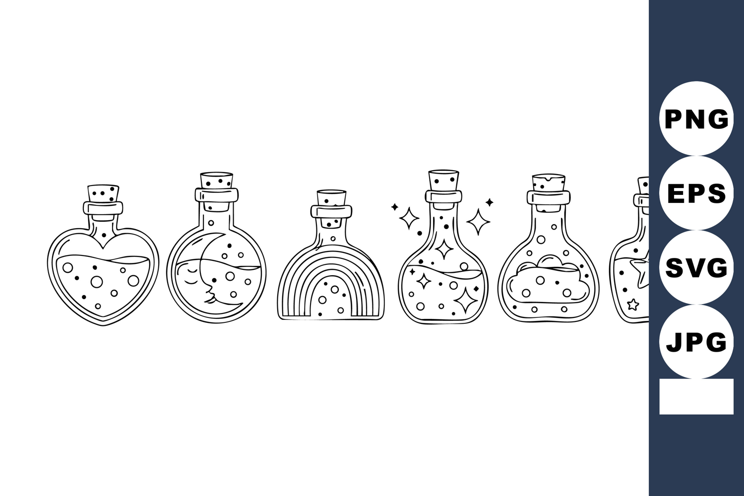 Vector line art showing six magical potion bottles with hearts, stars, sparkles, and bubbles. Each bottle has a unique shape and design, conveying fantasy and charm. Playful mood.