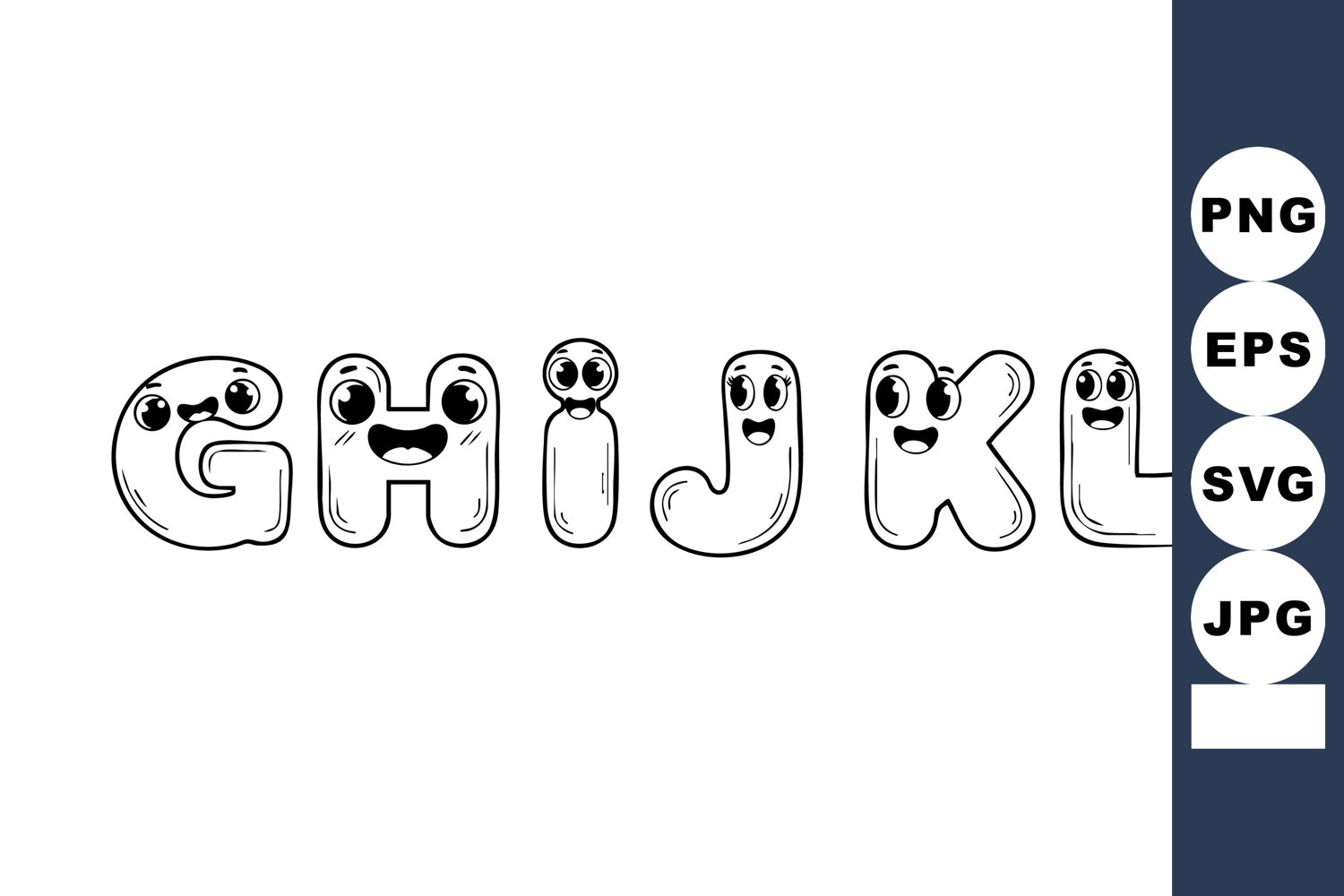 This vector image shows cartoon style letters G H I J K L with playful eyes and expressive faces in black and white. The design is whimsical and fun. Cheerful mood.