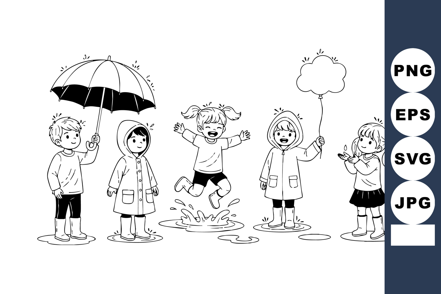 This vector illustration shows children playing outdoors with an umbrella, raincoat, and balloon. One child jumps in a puddle, while others smile and enjoy the playful scene. Cheerful mood.
