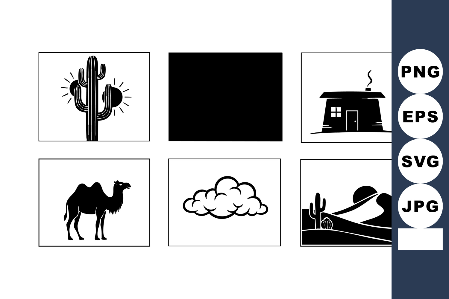 This vector set includes black and white icons of desert elements such as cactus, camel, cloud, adobe house, and sunset landscape, presented in a clean and minimal style. Calm and simple.