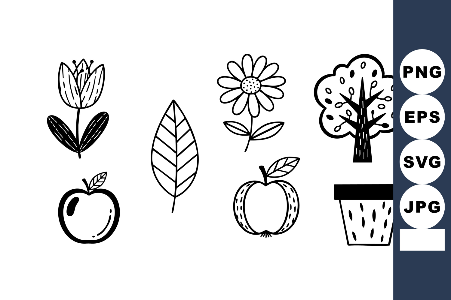 This vector set features simple black and white nature icons including flowers, tree, leaves, and apples designed for creative decoration and design projects. Minimal and clean style.