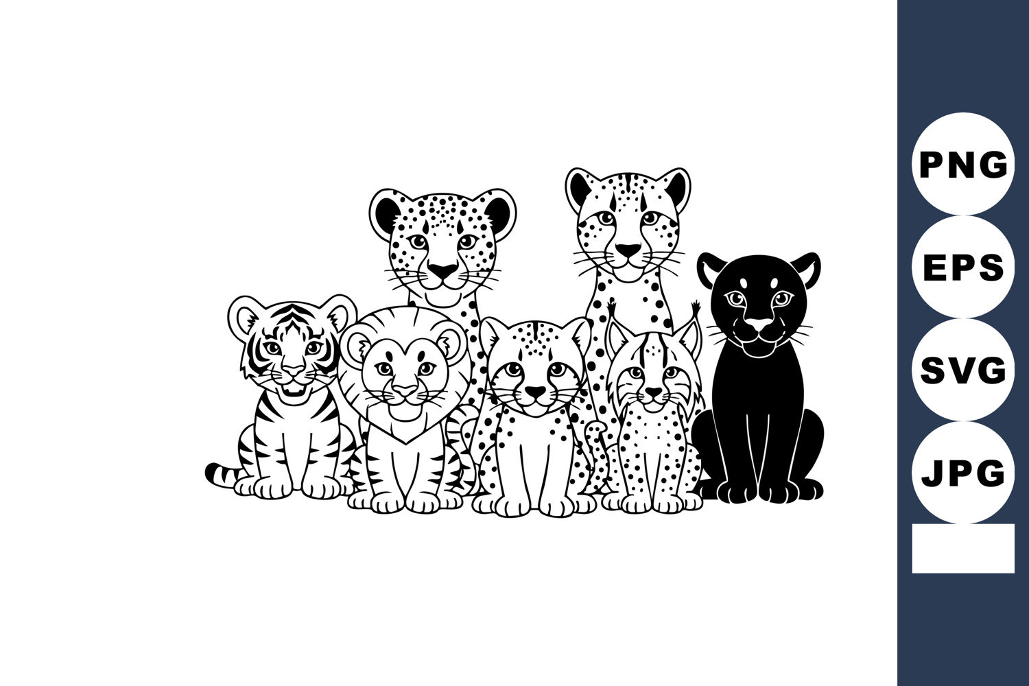 Illustration features seven wild cats sitting together including tiger, leopard, jaguar, and panther in black and white vector style, presenting a clean and minimalistic wildlife theme, calm mood.