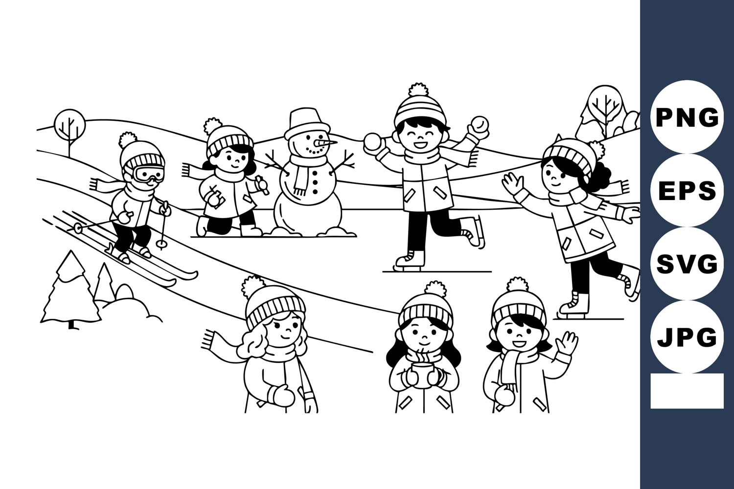 Children enjoy various winter activities such as skiing, skating, and building a snowman in a snowy landscape with trees and hills, creating a joyful and playful atmosphere.