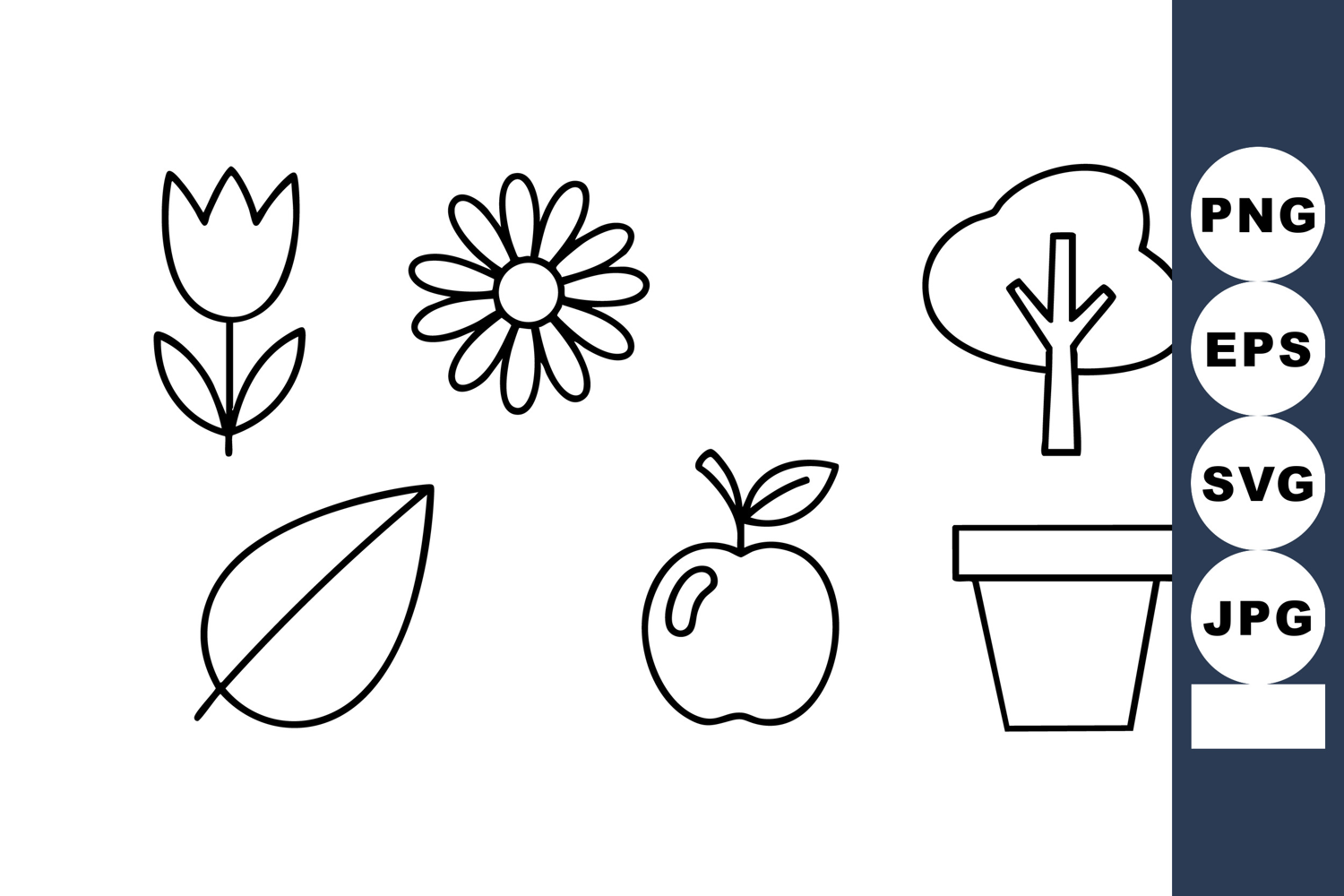 This vector file shows simple black line art icons including a flower, tree, leaf, apple, and pot. The clean design suits various creative projects. Minimalist and clear.