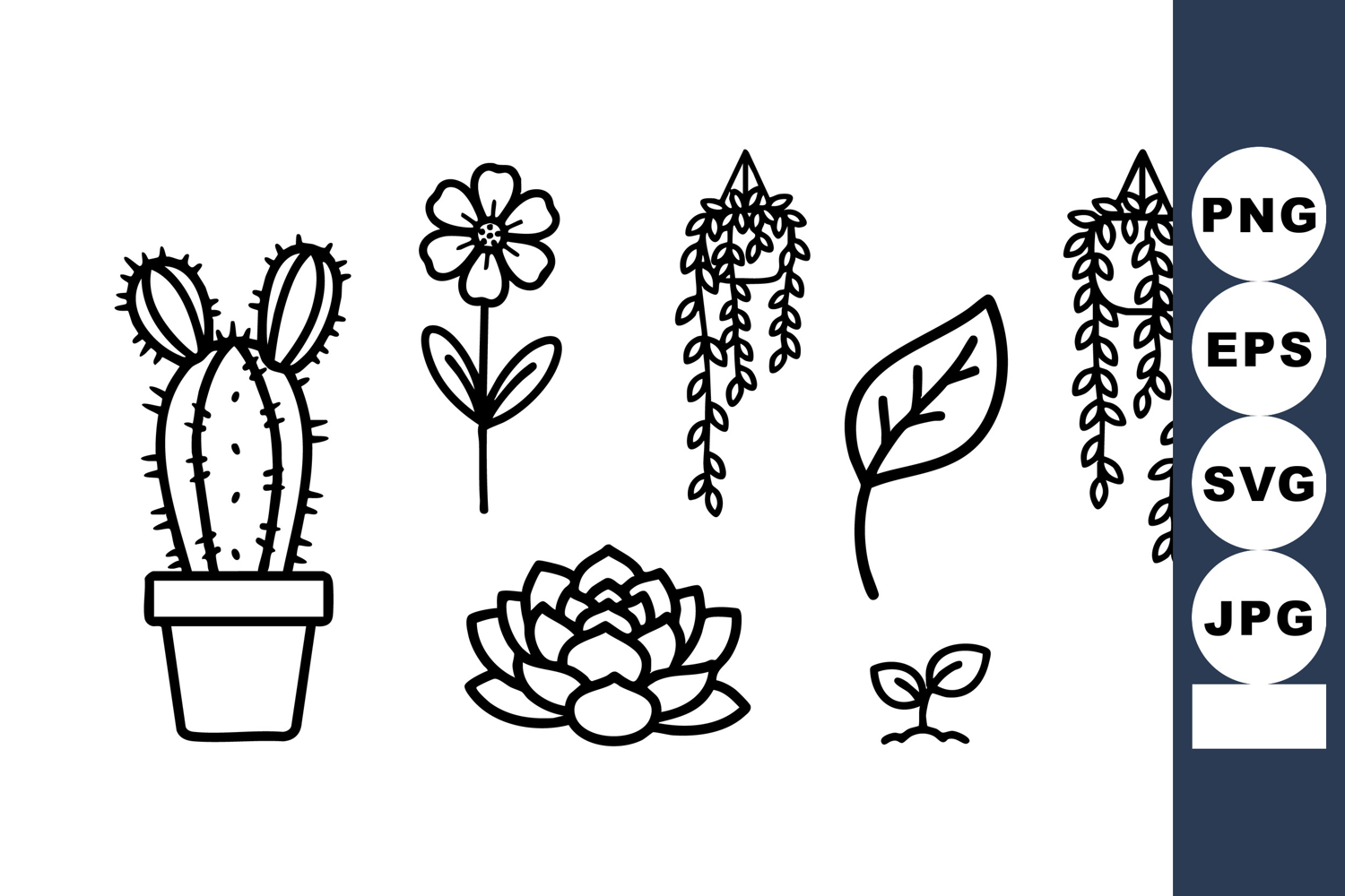 Vector line art features cactus, succulent, small flower, leaf, sprout, and hanging plants in simple black outlines for garden-themed design projects. Minimalist and clean style. Calm.