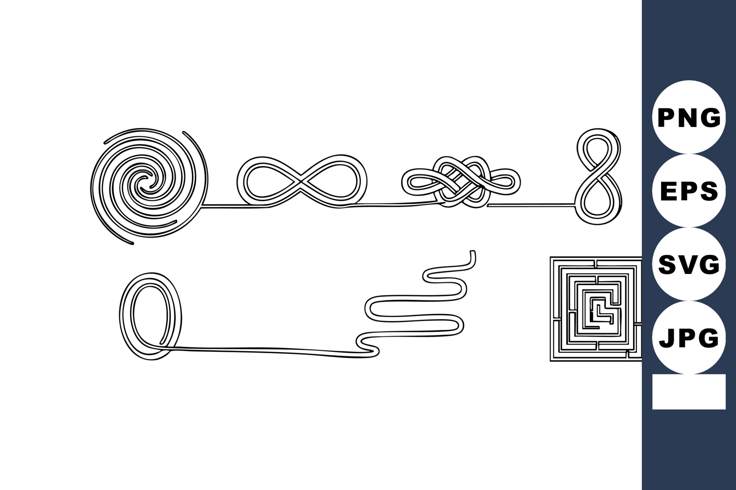 This vector file presents black and white abstract labyrinth and maze elements featuring spirals, knots, and infinity symbols in clean line art style, conveying complexity and creativity, minimalist mood.