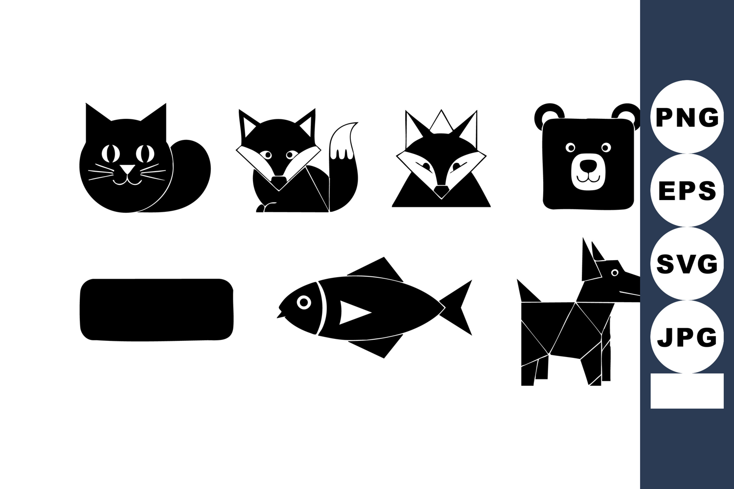 This vector file features simple black animal icons including cat, fox, bear, fish, dog, and a blank label, perfect for design and creative projects, minimalistic and clean style.