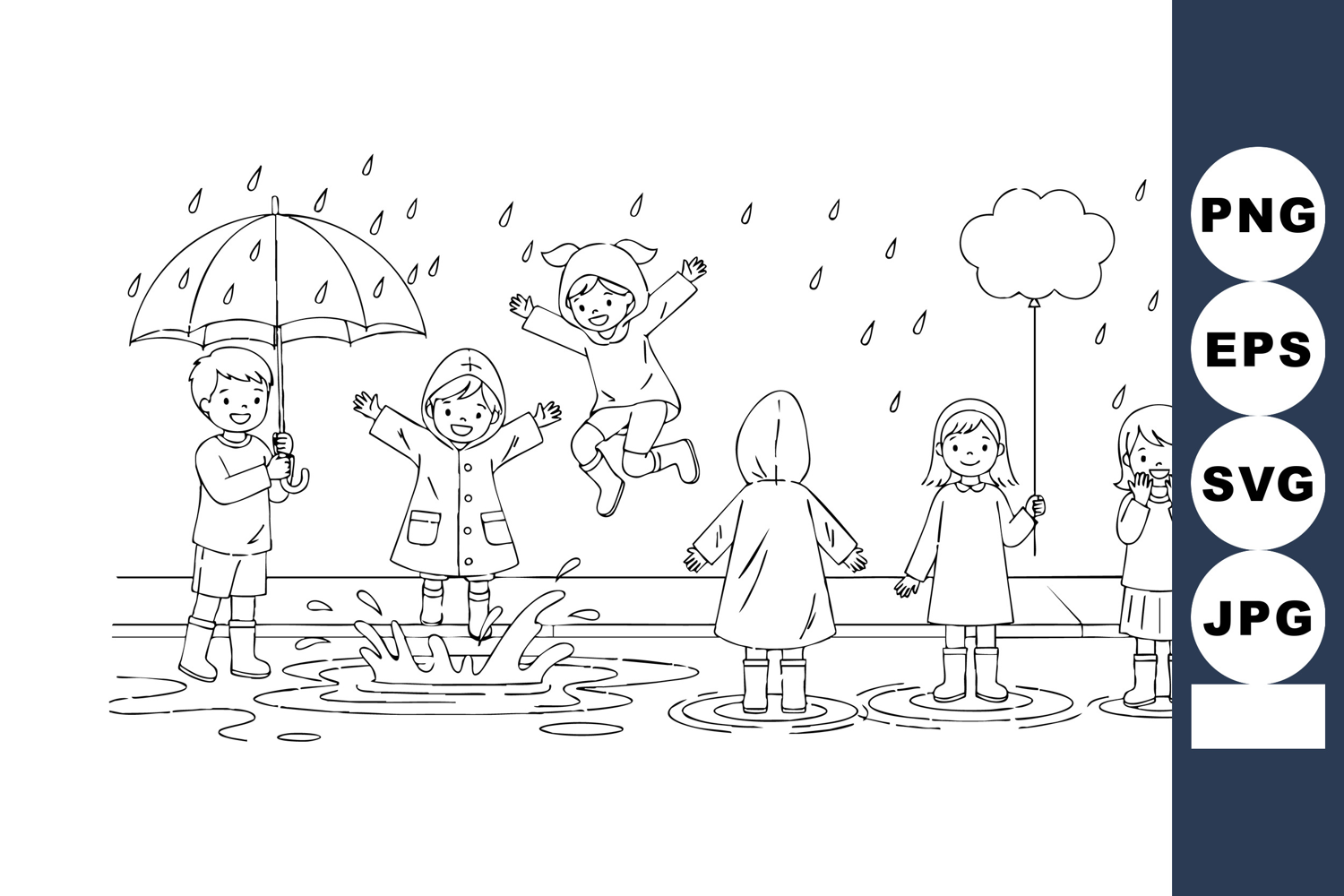 The vector shows children wearing raincoats and using an umbrella while splashing in puddles during rainfall, capturing a lively and playful outdoor scene in black and white. Cheerful mood.
